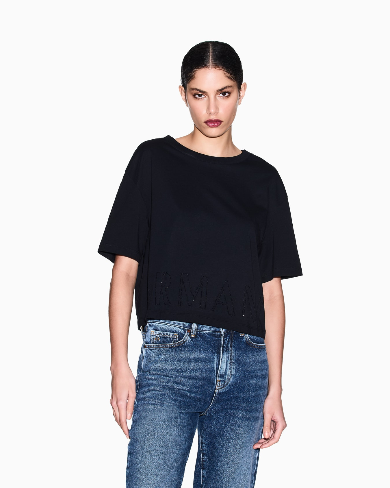 Camiseta Armani Exchange negra, de cuello redondo de mujer con logo en la parte baja .