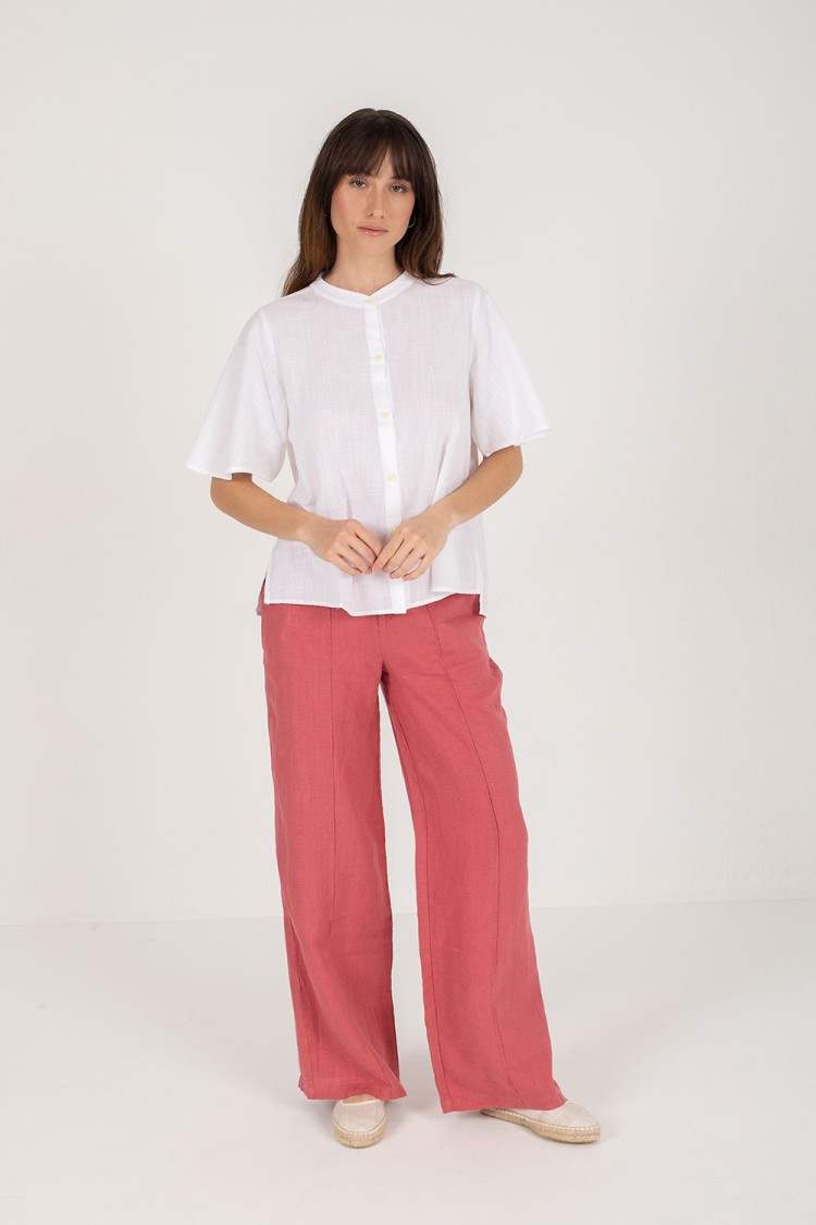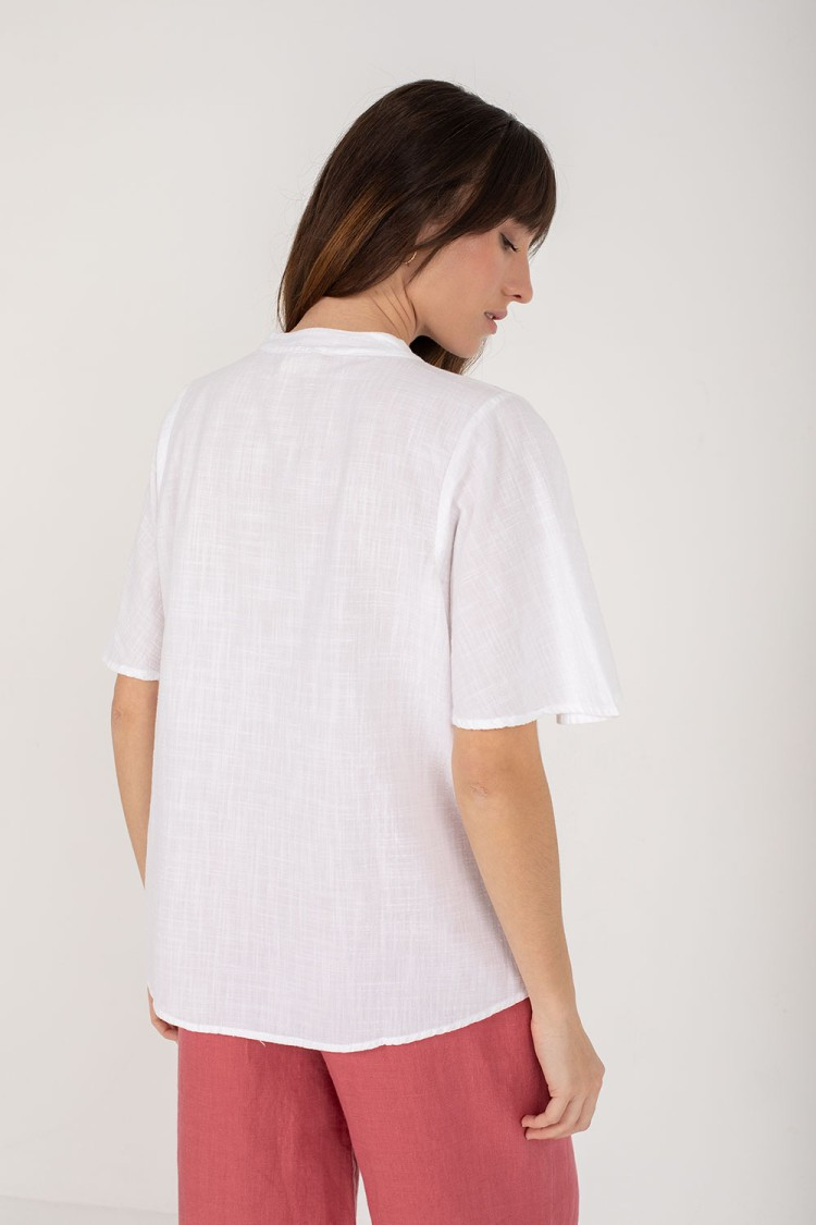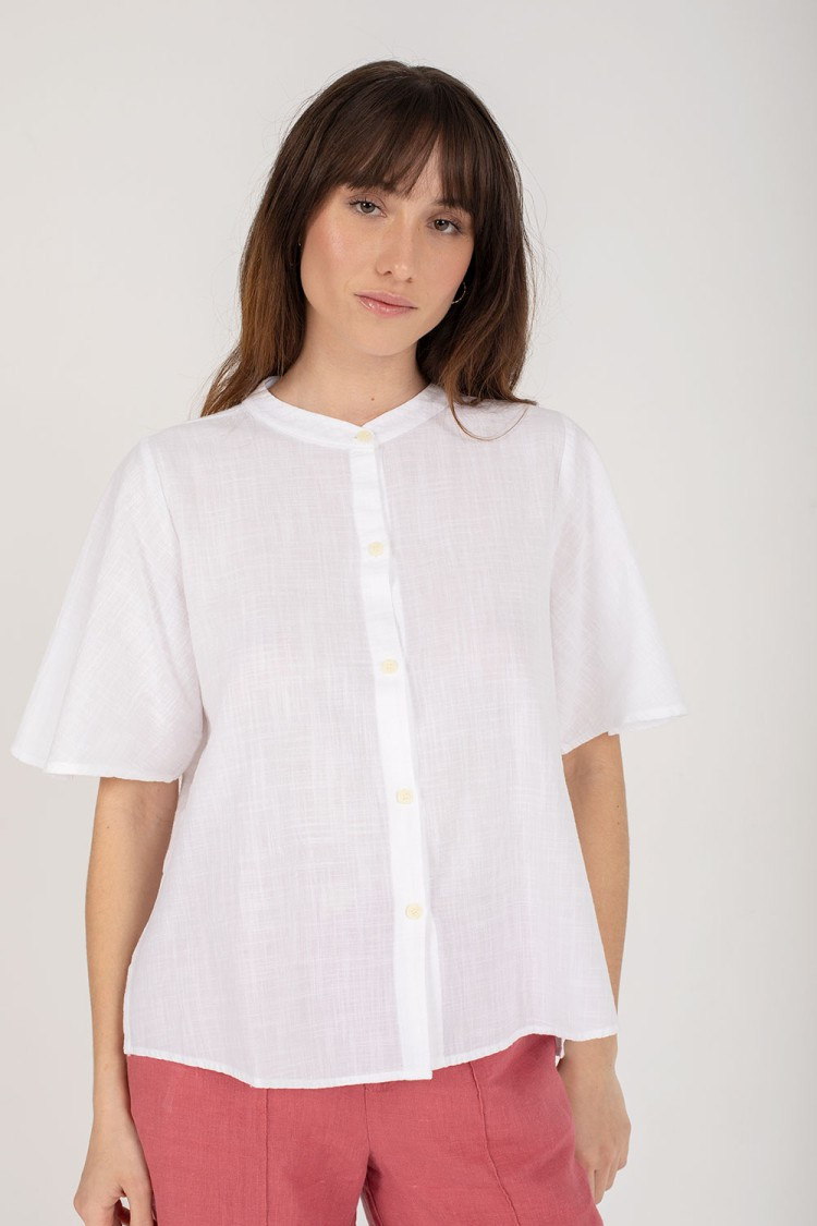 Camisa blanca Mus&Bombon blanca de manga corta, algodón 100%,cuello mao, cierre con botones y manga con vuelo de mujer.