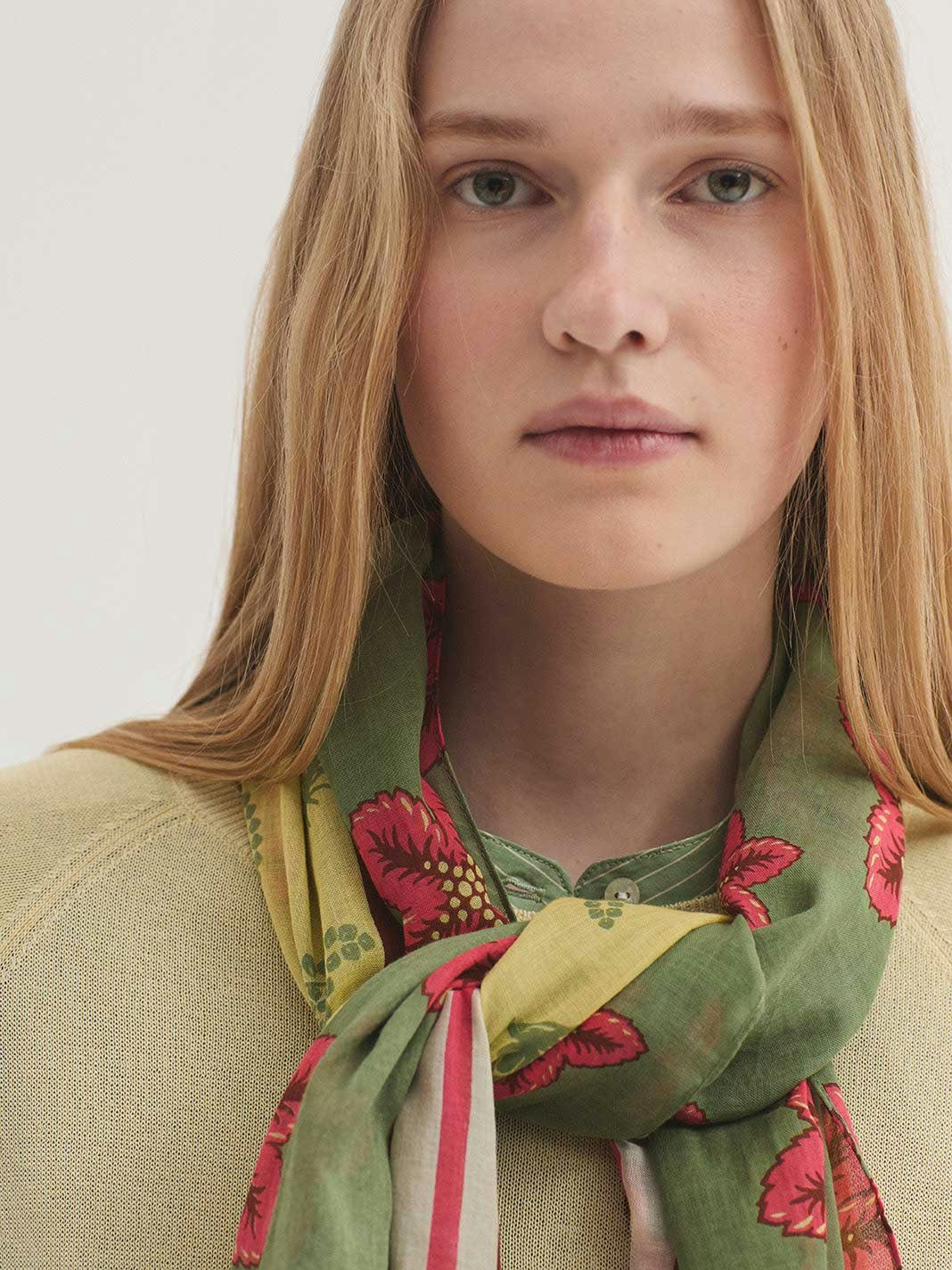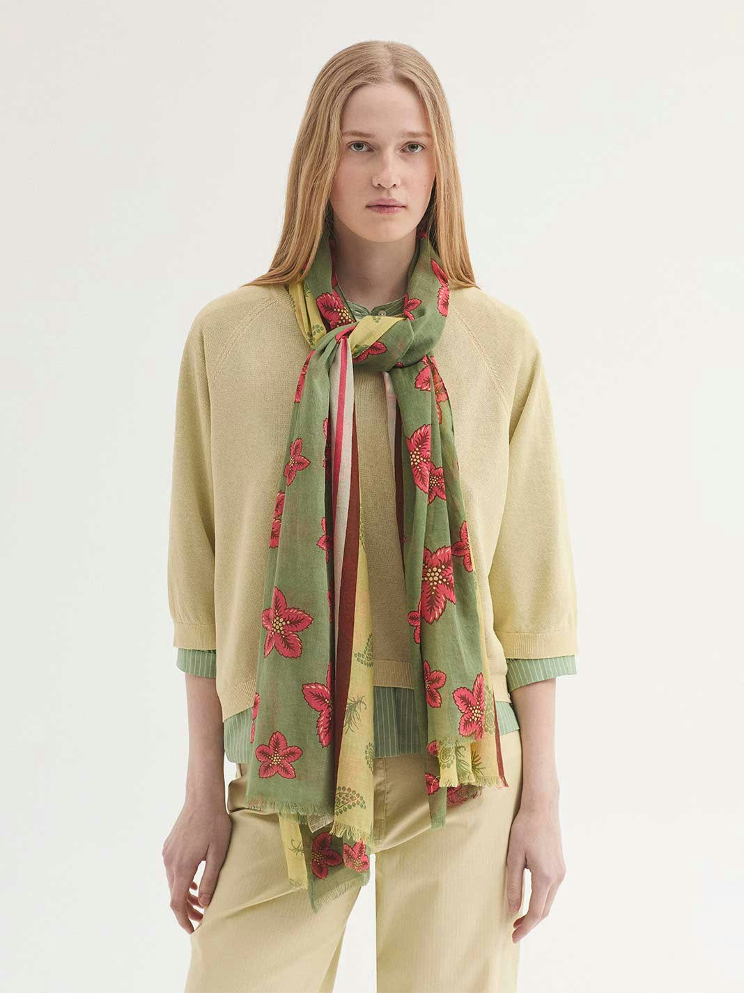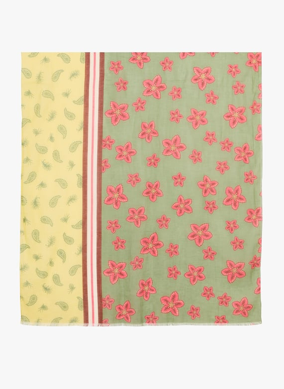 Fular Nice Things de flores verde y amarillo, hecho en algodón 100%.