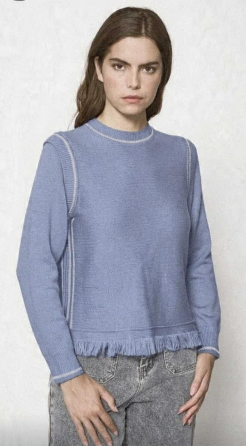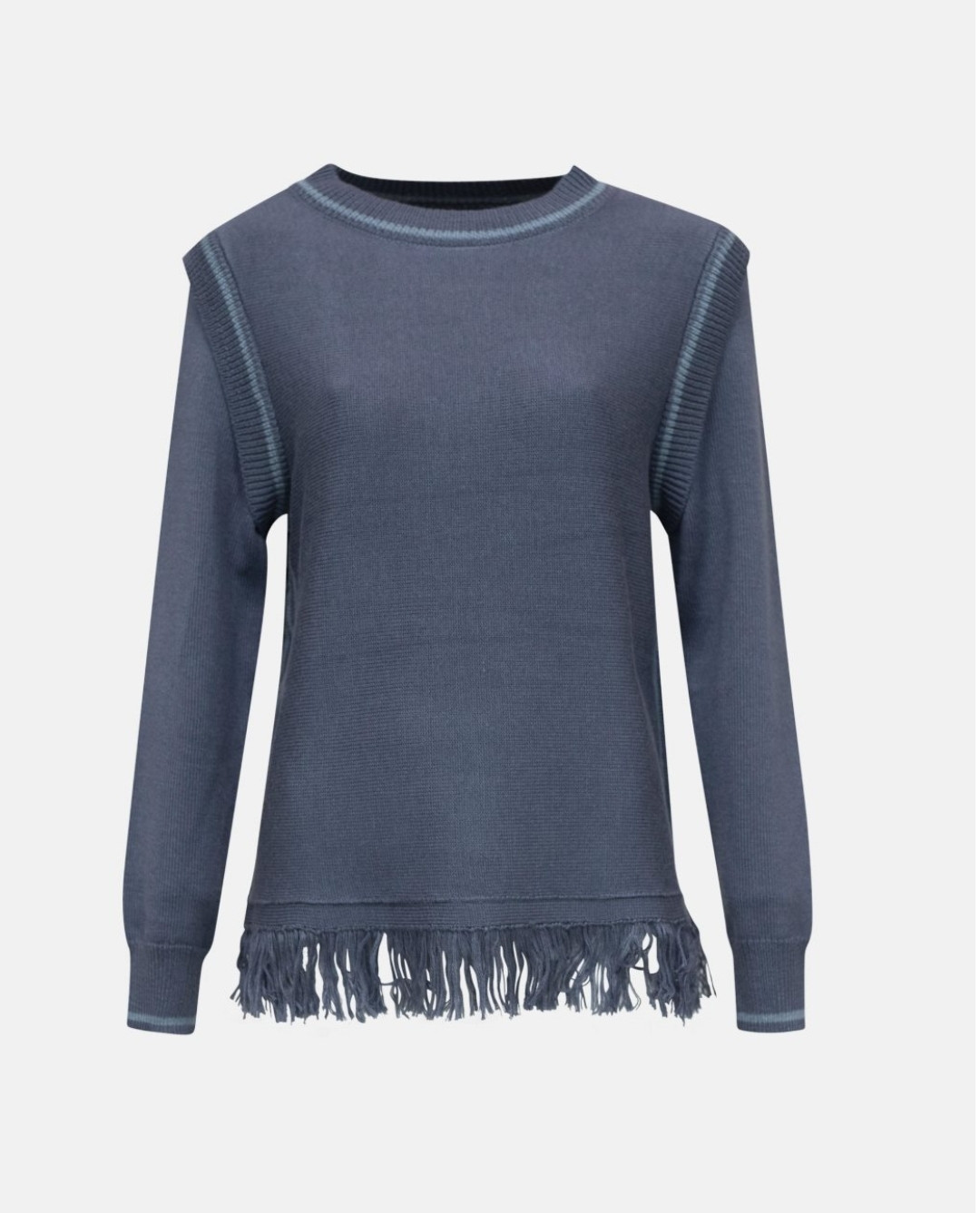 Jersey con flecos, cuello redondo con vivo en cuello, lateral de mujer. Hecho en poliéster, poliamida, acrílico y lana.