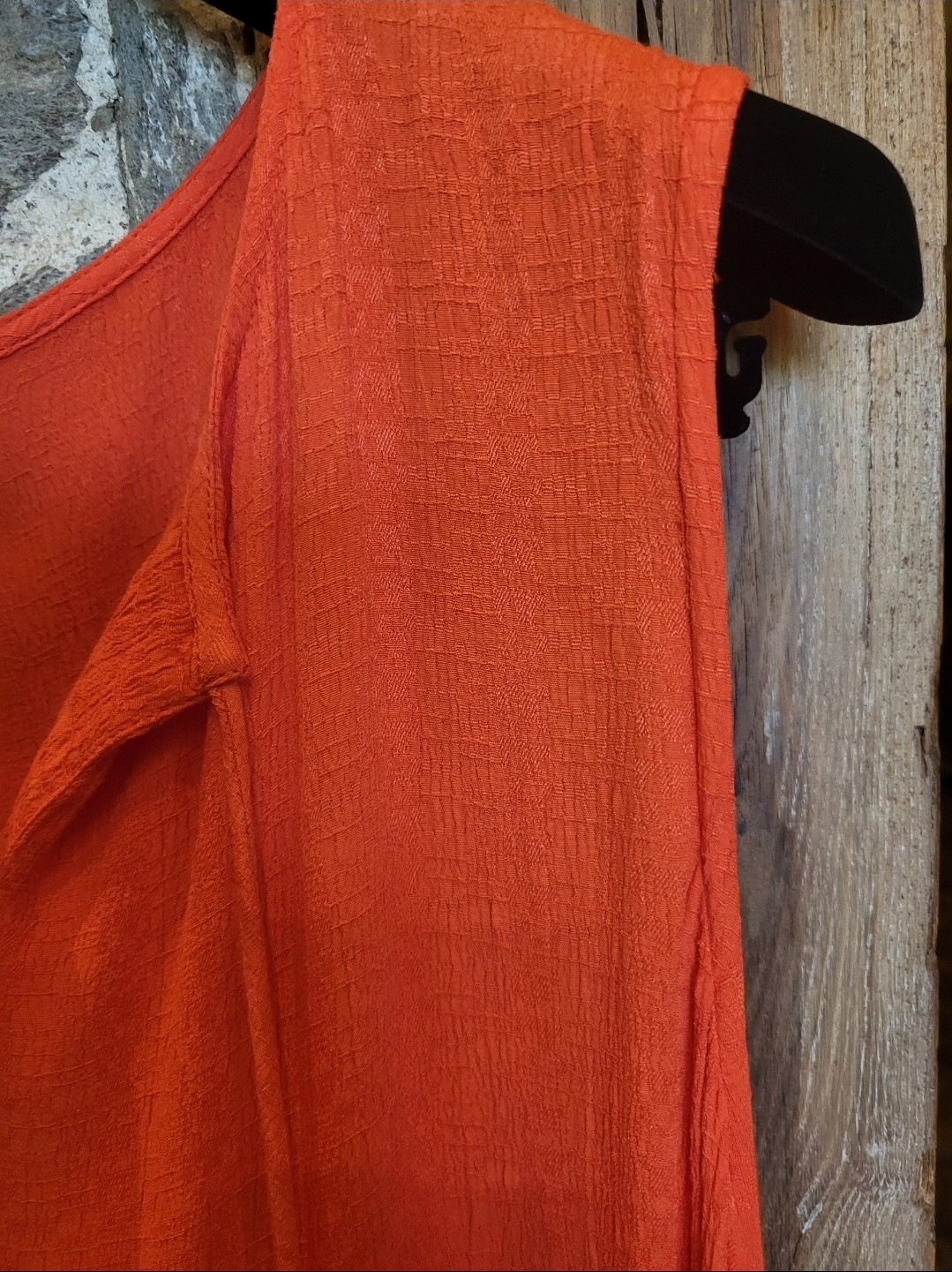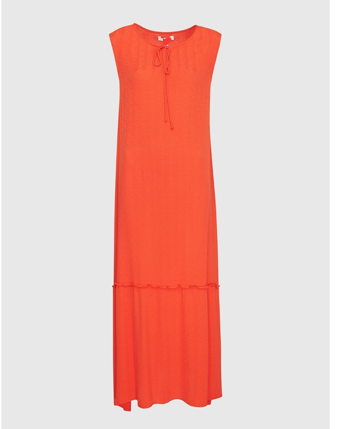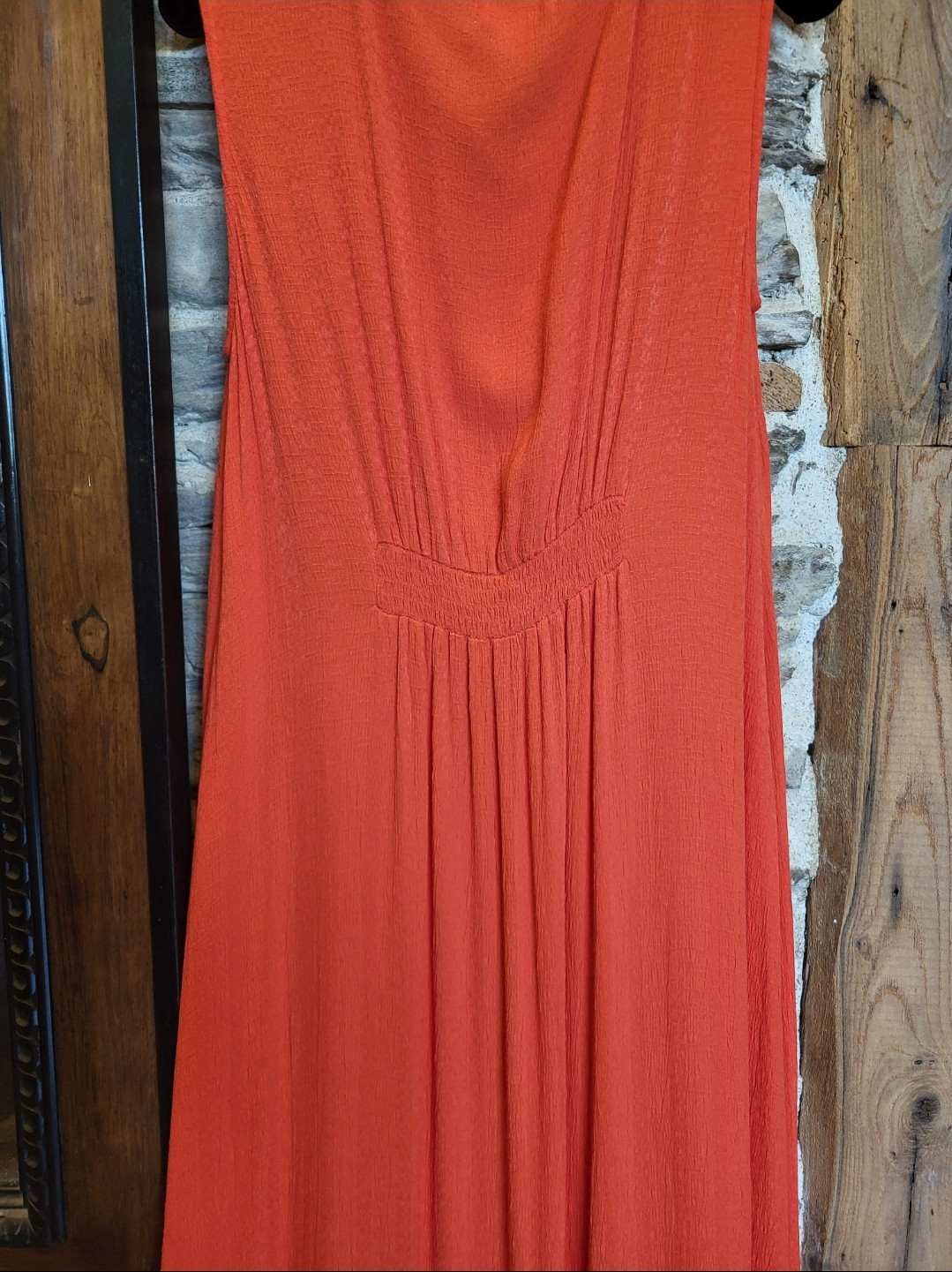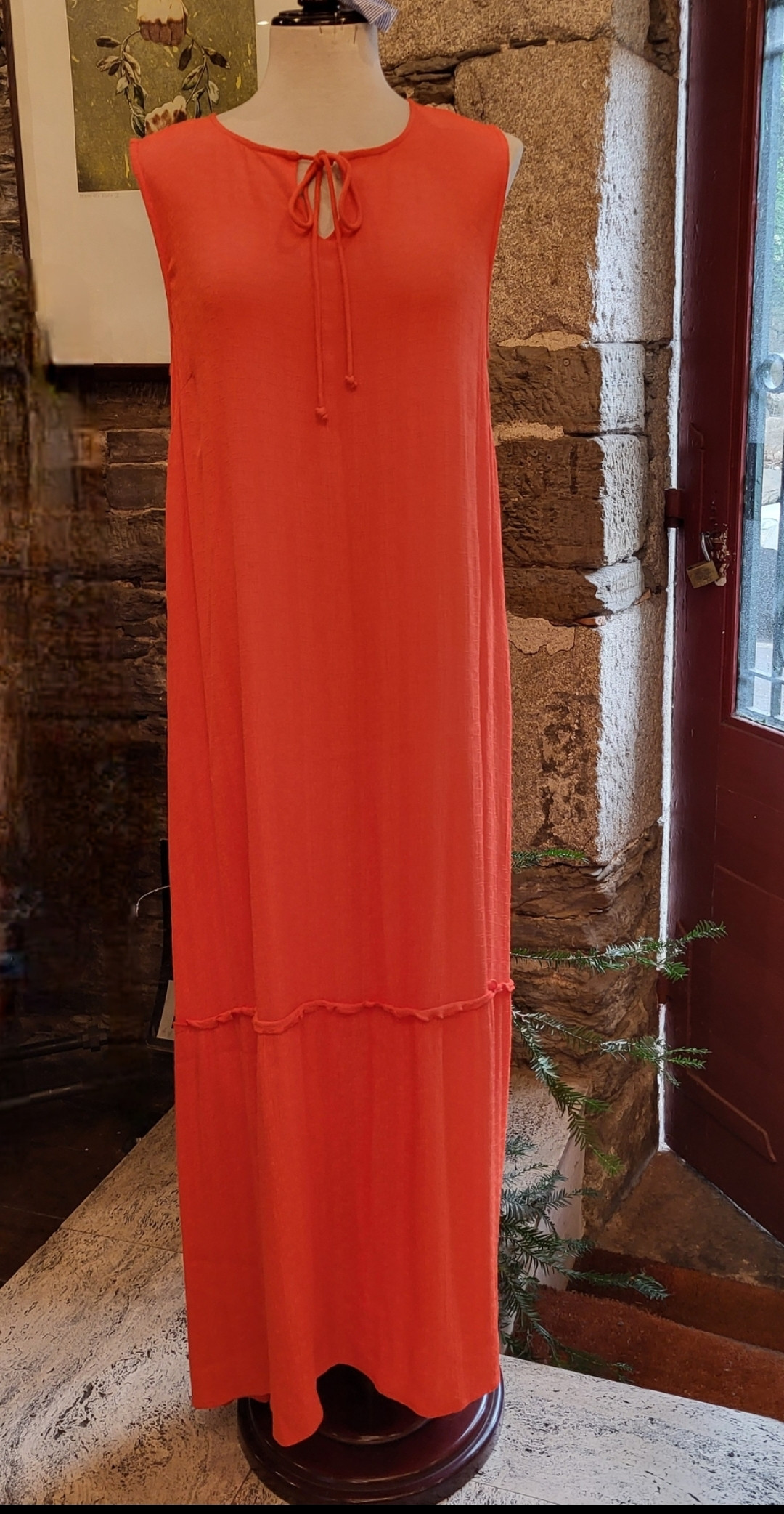 Vestido largo coral sin mangas, con pequeño escote en pico ,hecho en viscosa 100%.Posee pequeño elástico en la espalda.