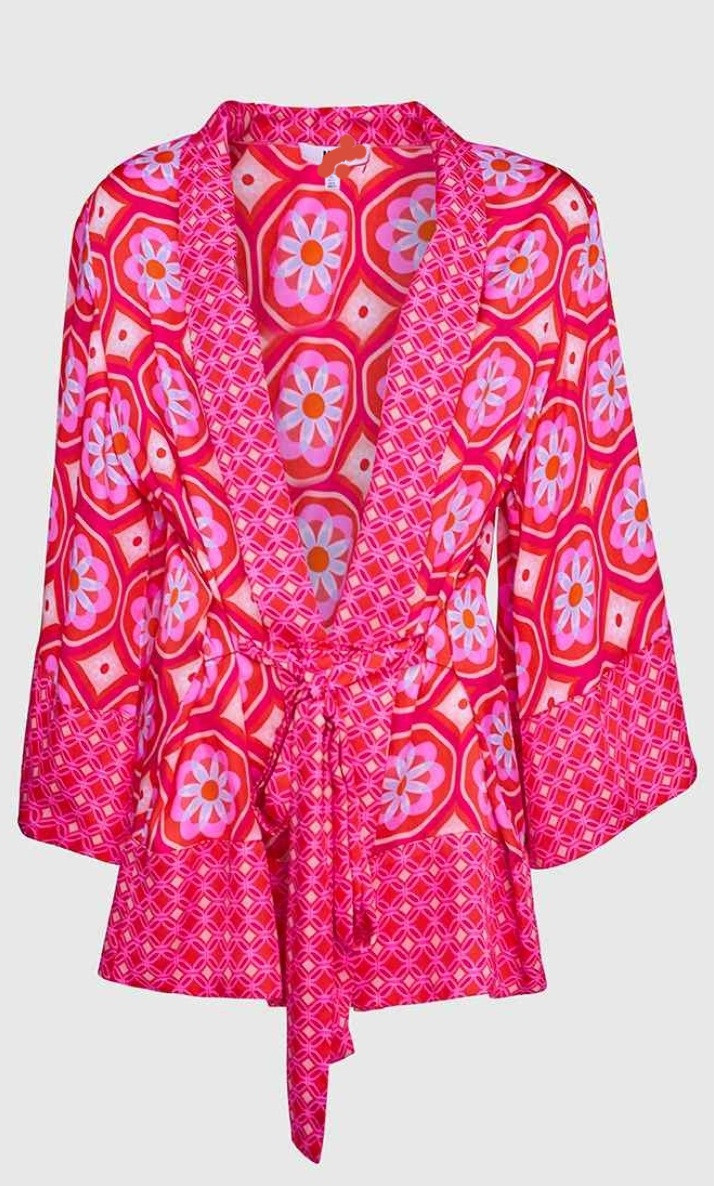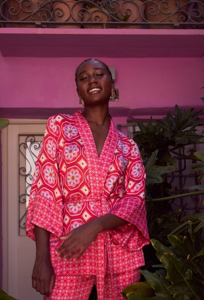 Chaqueta tipo kimono estampado azulejo, hecha en viscosa ,sin cuello con cinturón de mujer.